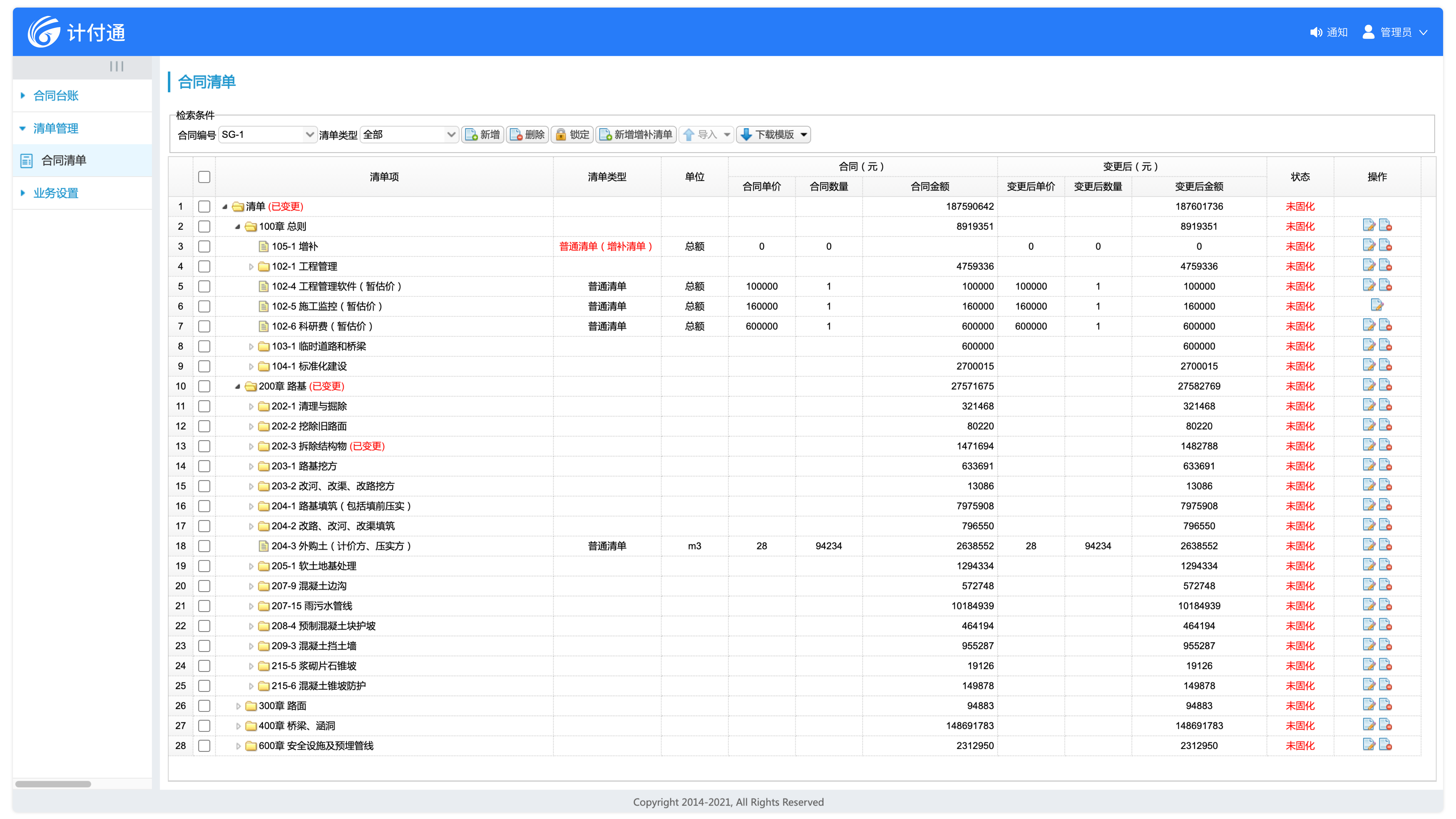 合同管理基本信息詳盡,約束條款中內(nèi)置各類計(jì)量依據(jù),是整個(gè)計(jì)量支付業(yè)務(wù)的源頭。