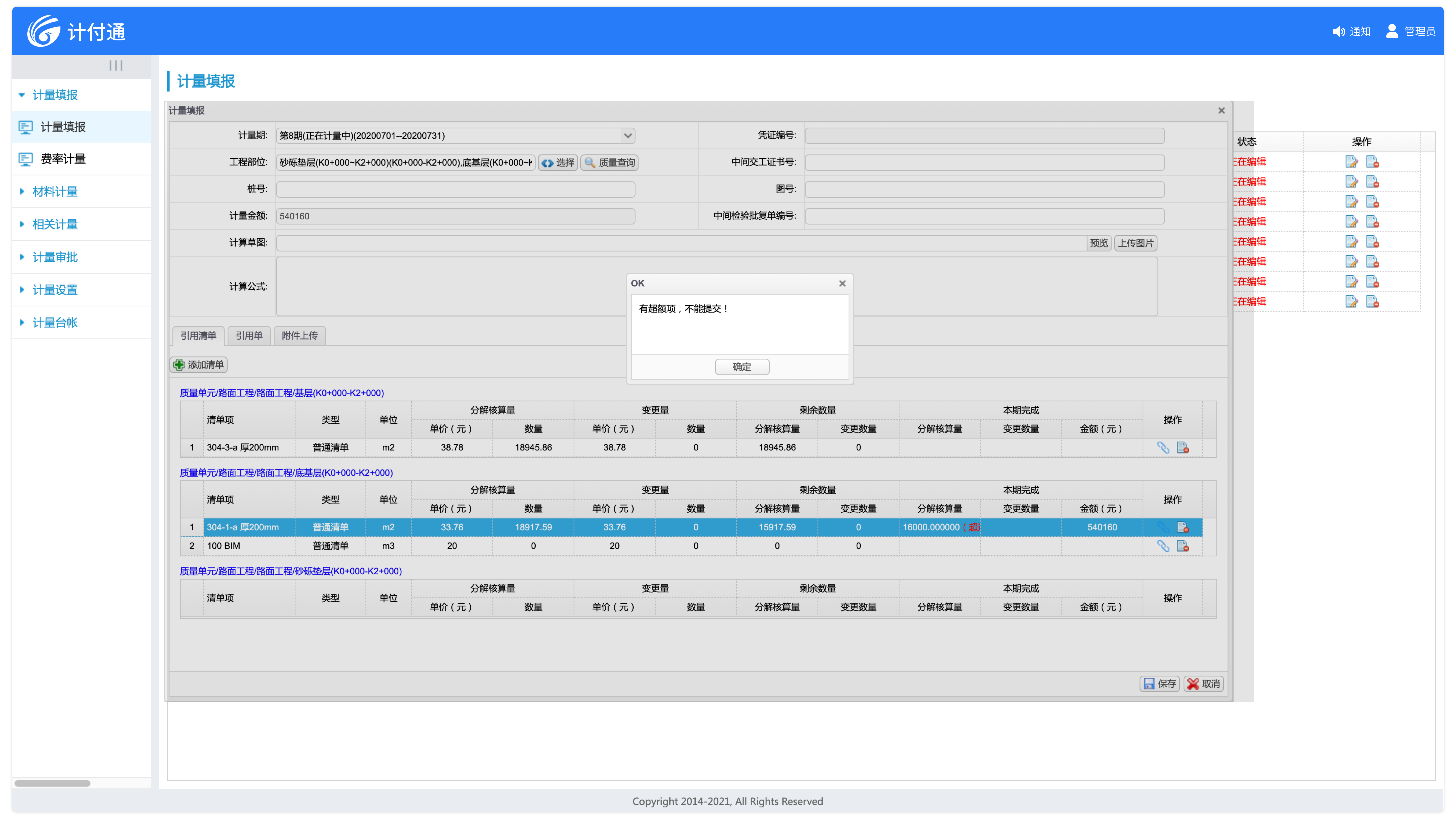 工程計(jì)量多方協(xié)調(diào),流程規(guī)范,程序合規(guī),適用多種承發(fā)包模式下的多種計(jì)量方式,計(jì)量支付全過程實(shí)時(shí)監(jiān)控,動(dòng)態(tài)透明,程