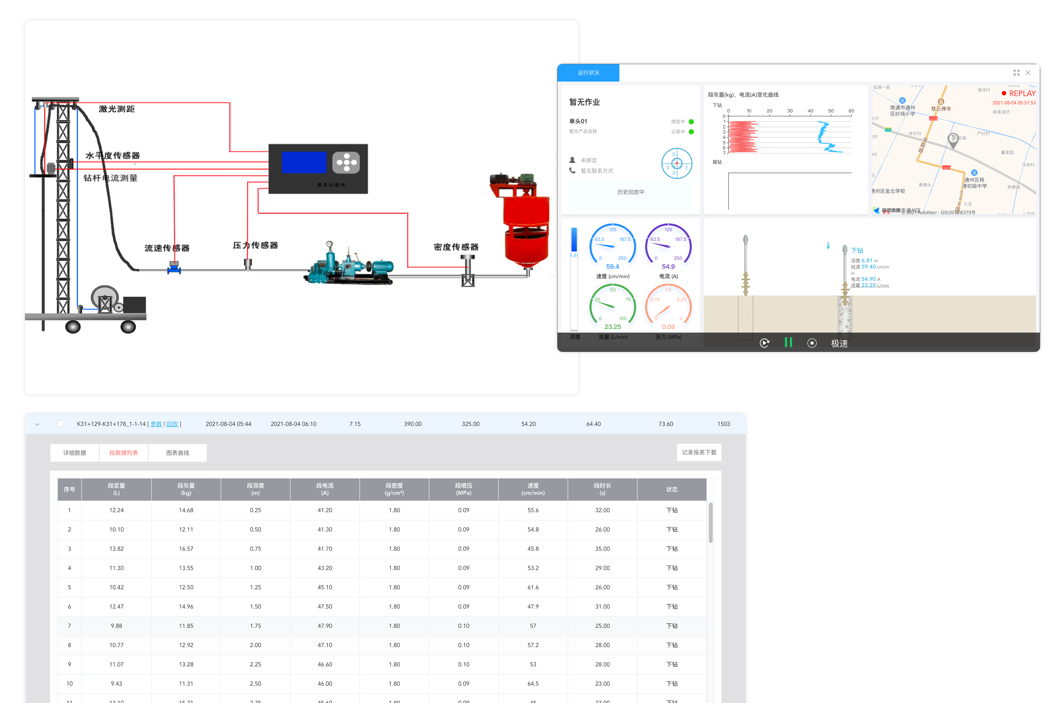 利用高精度定位,物聯(lián)網(wǎng)傳感器等技術(shù),在施工過(guò)程中實(shí)時(shí)采集鉆樁深度、鉆樁速度、鉆桿電流、傾斜度、水泥漿流量、材料